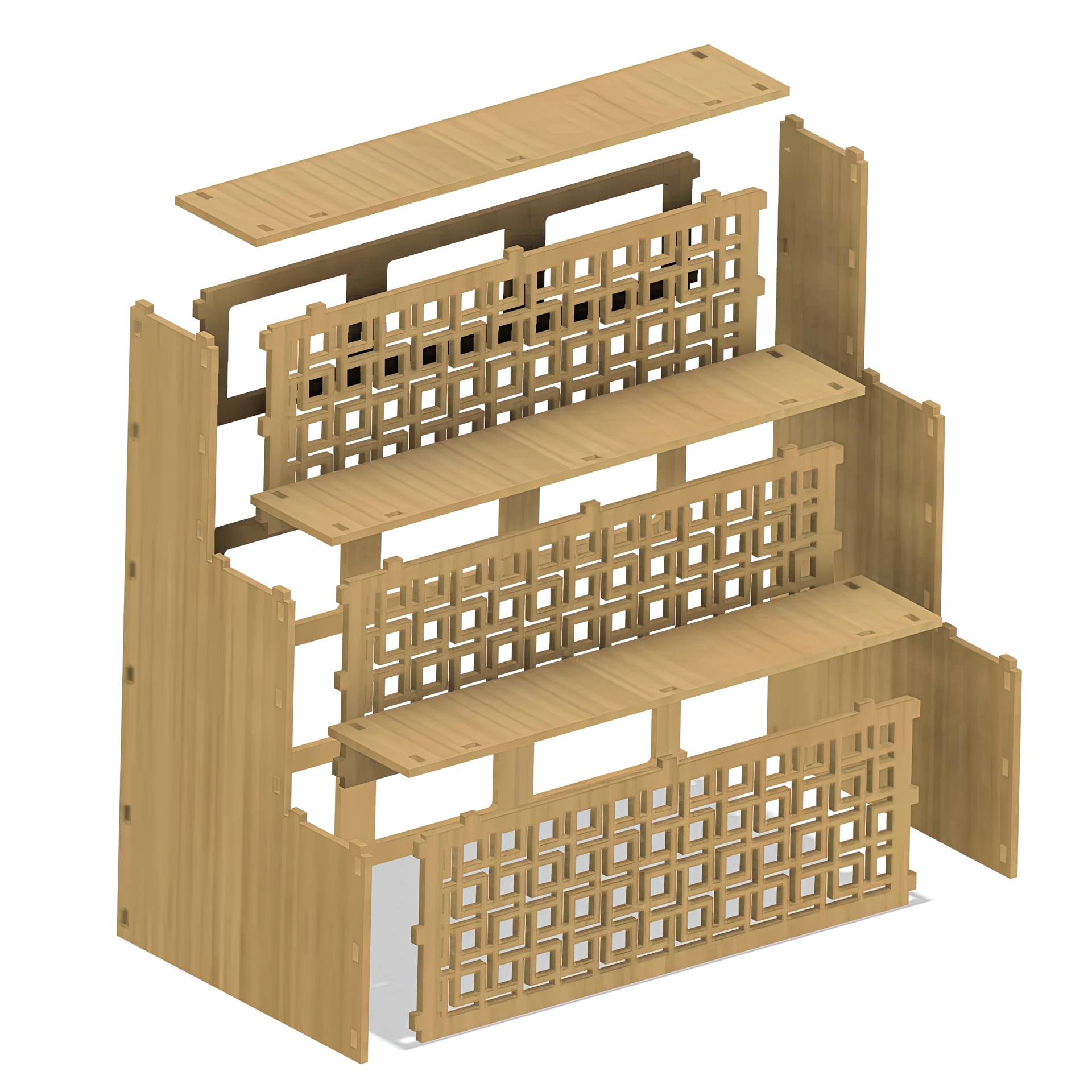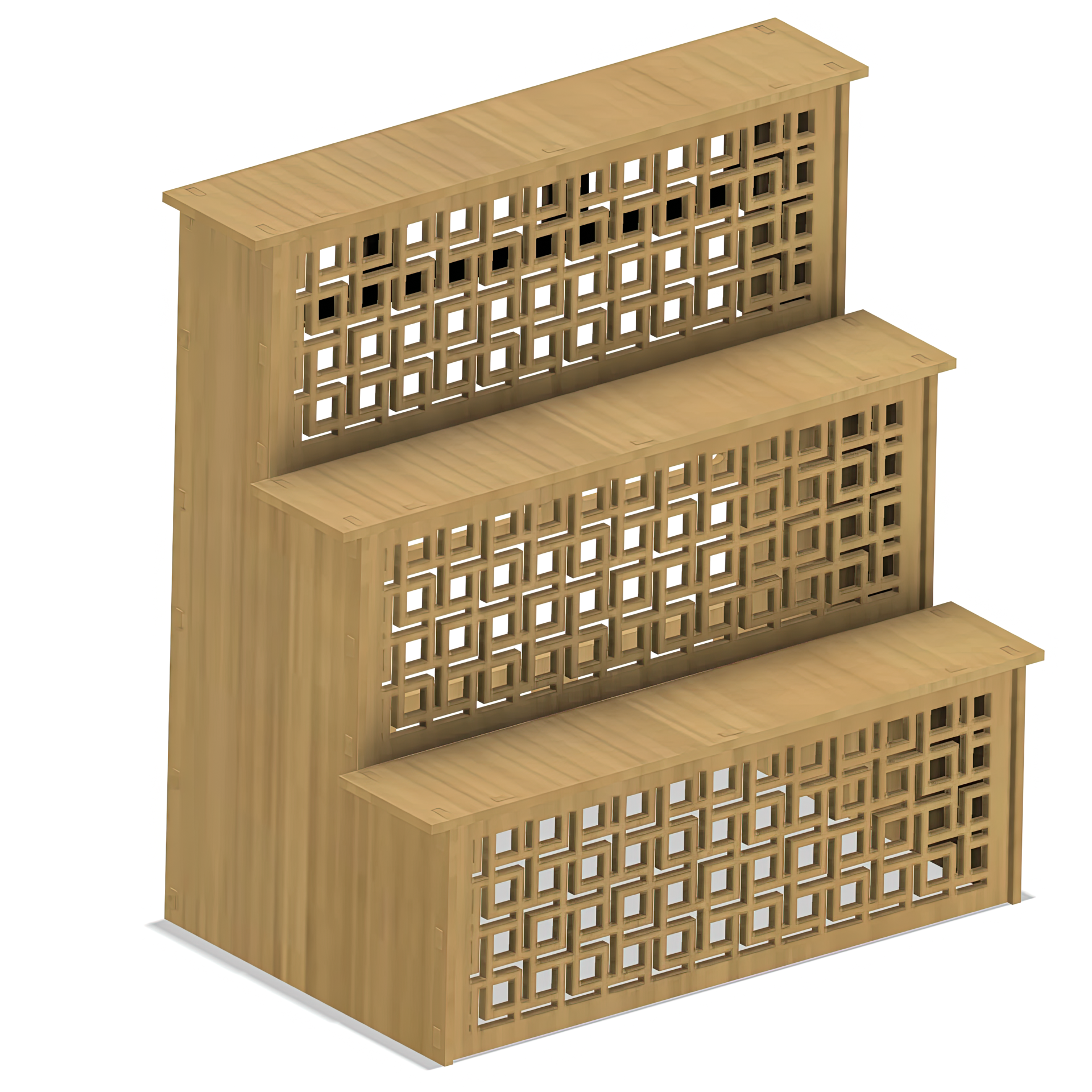 Laser cut your own Tumbler display stand. This 3 tiered shelf is perfect for displaying Tumblers at your next show! Or display other knick-knacks proudly. Each shelf can hold up to 5 twenty ounce tumblers, or 6 twenty ounce skinny tumblers. 3 different front panels are included with different geometric patterns. Choose and cut your favorite, or leave it blank.